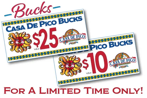 Pico Bucks are certificates that can be used like cash on your next visit to Casa De Pico. They enhance your dining experience by offering additional value, although they have no cash value and no cash was paid for them.