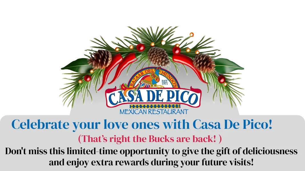 The Casa De Pico gift card promotion is a limited-time holiday season offer where customers can purchase gift cards and receive additional Pico Bucks as a bonus. Buy $50 in gift cards and get $10 in Pico Bucks, or buy $100 in gift cards and get $25 in Pico Bucks.